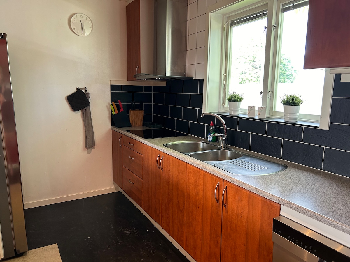 新翻修的65平方公尺公寓,最多可容納6人。 有一張舒適的160張牀和沙發牀,以及根據要求增加2張額外的80張牀。 鬱鬱蔥蔥的戶外環境和斯堪的納維亞鄉村裝飾,從地板到天花板的木板。 安靜的配色方案,設備齊全的廚房、洗衣機和烘乾機。 步行即可抵達森林,開車10-15分鐘即可抵達市鎮,7分鐘即可抵達湖泊、高爾夫球場和健身房。 夏天時,花園裡有露台、彈床、足球場,還有漿果樹和果樹。