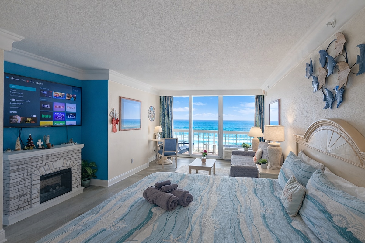 *** Brand new pool and beach access are open!*** Welcome to Daytona Beach Bliss! Enjoy our newly remodeled oceanfront studio just steps from the beach. The private 5th floor balcony has a beautiful direct ocean view! Catch the sunrise in the morning and you might even spot some dolphins! Located in Daytona Beach Club, this cozy studio sleeps 4 with a king bed and a pull out couch. The space is best suited for 2 adults or a family with 2 adults and 1-2 kids.