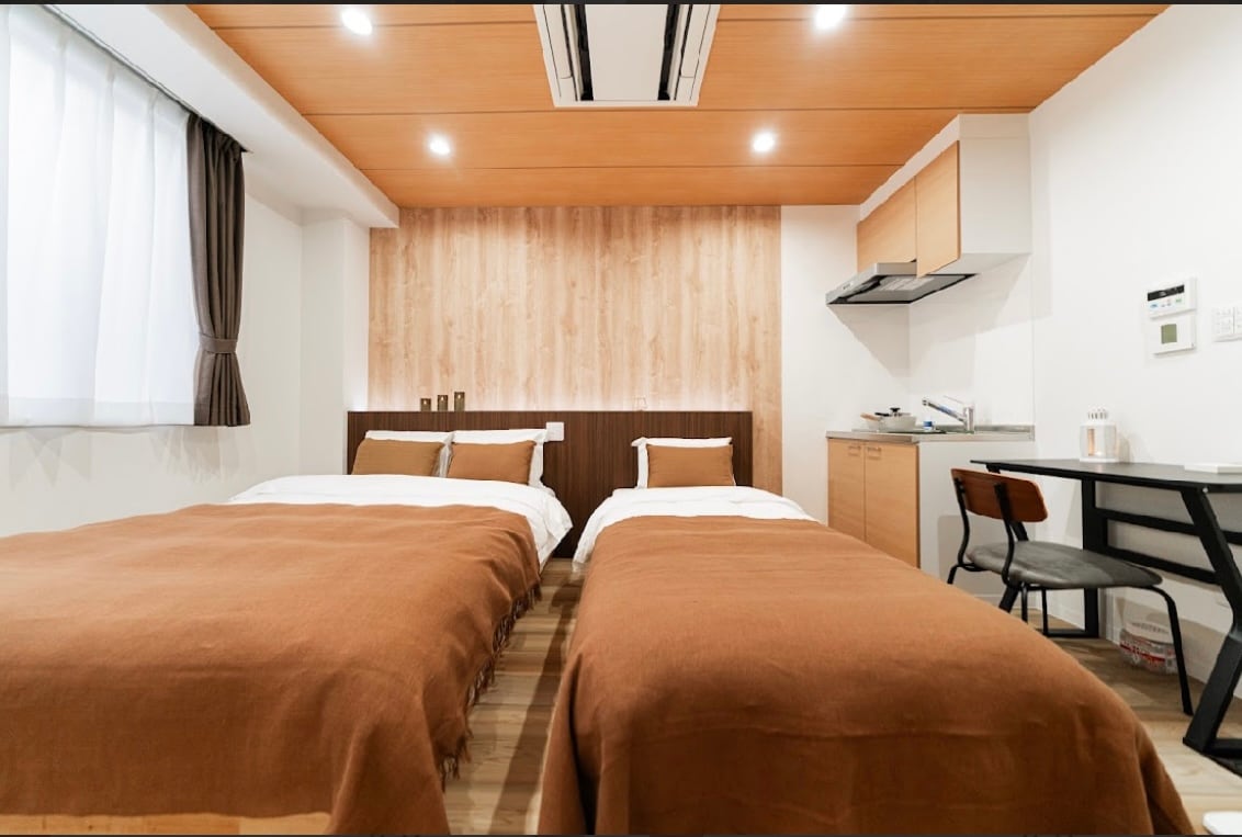 走进这间位于东京墨田区、晴空塔附近的一楼新公寓,浅木色的空间与柔和灯光交织,带来放松与温暖的居住体验。 房源布局 • 宽敞客厅 舒适沙发与电视,让旅途的片刻闲暇变得轻松愉快。 • 开放式厨房 配备基础厨具、餐具、电热水壶、冰箱、微波炉等家电,适合偶尔动手做一顿温馨的家常饭。 • 两间独立卧室 各配备 1.6m × 2.0m 的大双人床,柔软舒适,布置清新现代,让人一进门就倍感放松。 • 卫浴设备 • 干湿分离设计,保持空间整洁清爽。 • 设有浴缸与独立淋浴间,可在旅途中舒缓身心。 • 双洗面台设计,让早晚梳洗更高效。 • 配备一次性牙刷、吹风机等基础洗漱用品。 • 洗衣机带烘干功能,出差或长住也能轻松应对洗衣需求。 舒适便利的地理位置 • 步行范围内有便利店、超市、咖啡厅、地道日式餐厅。 • 步行约3分钟即可到达东京晴空塔与晴空塔城购物中心 • 交通便利,可轻松前往浅草、上野、秋叶原等热门区域 房源特色 • 全新装修,温馨明亮 • 双卧设计,适合家庭、情侣或朋友同行 • 一楼户型,无需爬楼,出入方便 • 免费寄存行李室