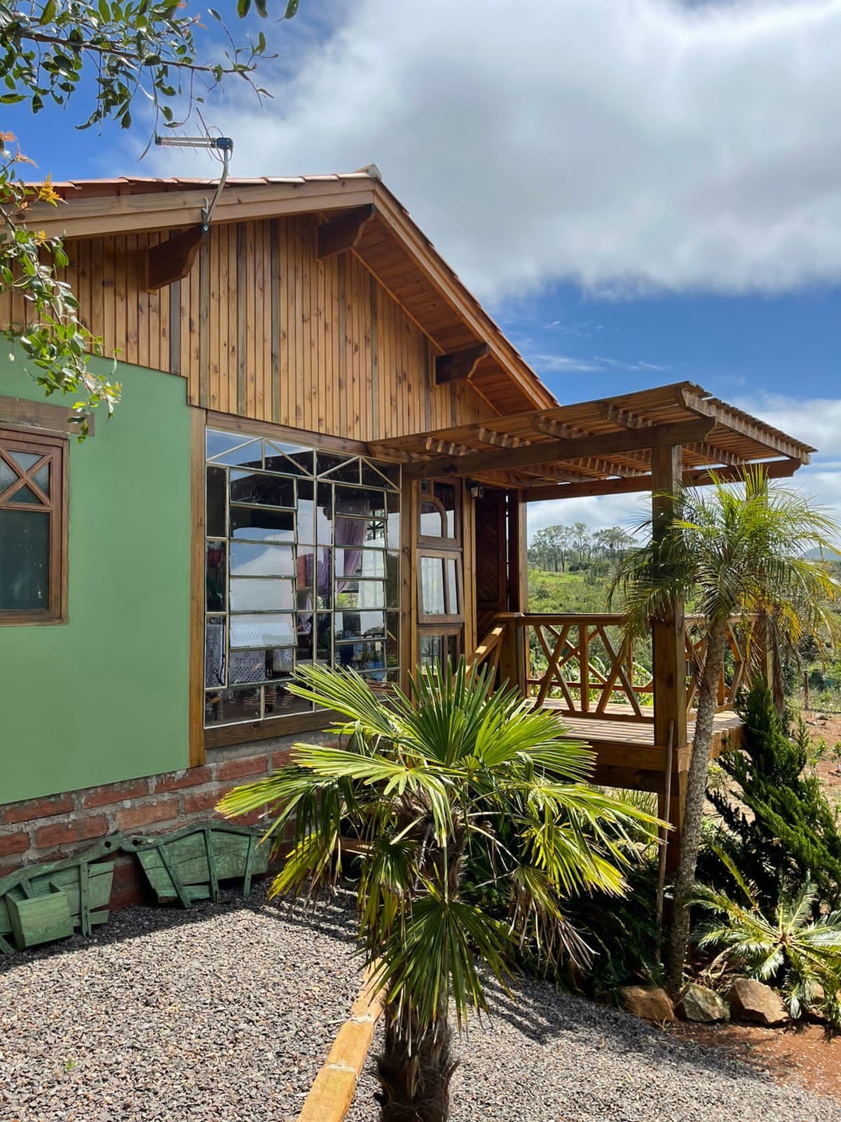 A cabana Ipê Amarelo tem 58 metros quadrados, varanda e sacada com vista privilegiada para os morros do Caraá/RS. Acomoda ate 4 pessoas. Nossas cabanas são de uma arquitetura rustica e aconchegante, proporcionando uma experiência de total integração com a natureza. Os projetos e todo o trabalho de construção é feito pelos proprietários.