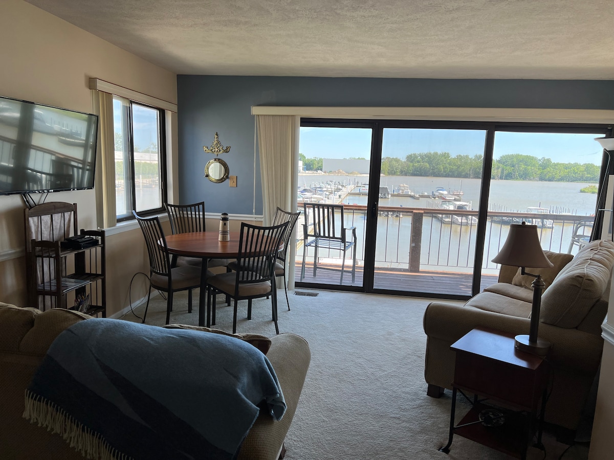 三樓舒適的單間臥室單間浴室公寓。從兩個陽臺可欣賞伊利湖和波蒂奇河的美景。設備齊全的廚房和洗衣機烘乾機。乾淨、更新的浴室。私人WiFi。可使用泳池、按摩浴池和桑拿房。靠近Jet Express、克林頓港市中心和其他伊利湖岸和島嶼景點。舒適的雙人床。客廳配有拉出式沙發床和額外的沙發和躺椅。 非常適合觀鳥者、情侶、單身人士或小家庭入住。