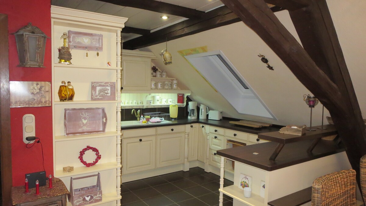 Koboldhütte 是一間現代化翻新的公寓,位於一棟建於 1750 年的房屋內。天花板高度約為 2 公尺,與當時的建築風格一致! 如有任何問題、疑問和要求,我們很樂意親自為您服務。我們住在同一個物業。我們的前門在後面的陽台下。