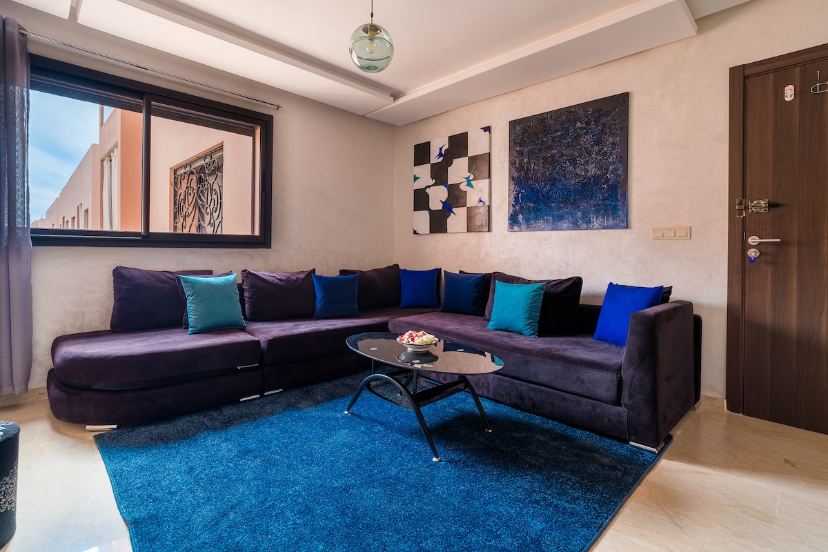 優雅的公寓,位於安全的高級村莊,配有私人花園和辦公桌,非常適合遠距工作。 快速光纖網路。 享受3個游泳池,全天放鬆身心。 靠近所有便利設施,距離Palmeraie 5分鐘,距離Guéliz 7分鐘。 舒適的臥室、傳統的浴室和現代的客廳。 精緻的裝飾結合現代舒適與摩洛哥魅力。 安靜的住所,非常適合在馬拉喀什度過安靜的住宿。