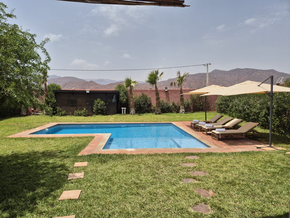 來山腰與家人一起放鬆身心,享受無對面的泳池和私人土耳其浴。兩間臥室和主人套房讓您在這座別墅中享有私密空間,讓您的假期更加美好。距離阿加迪爾 (Agadir) 35 分鐘車程,您可以隨時在海灘上放鬆身心。這個地方有樹木,有圍欄,有警衛。開車 5 分鐘即可抵達餐廳。