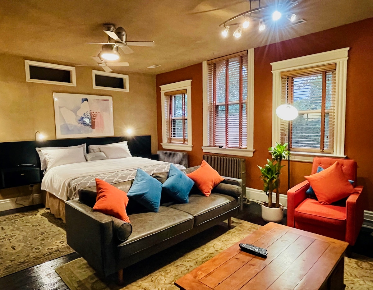 This open floor plan loft is on the first floor of an 1897 Carriage House. 1k sf, 12' ceilings, exposed brick and other beautiful elements. Fully equipped new kitchen with MASSIVE island, new bathroom, beautiful modern furnishings and a dedicated work space. This was once the stables of the carriage house of Frank Enger. Mr. Enger’s family manufactured carriages in the 1800s. When Frank took over, he eventually began putting motors in the carriages and ultimately founded the Enger Motor Company.