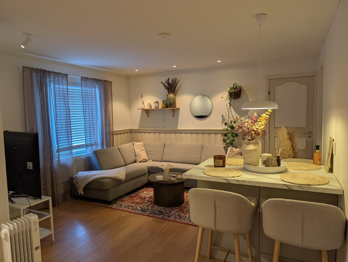Fin og moderne leilighet med sentral beliggenhet. Nyoppusset i 2019. 7 minutter gåavstand til sentrum. Stille nabolag. God sofa som kan brettes ut ved behov for ekstra soveplasser, medfølgende tykk madrass, fint spisebord og behagelige stoler. Kjøkken og bad. Gode senger. Dundyner i høy kvalitet. Rullegardin på soverommet. Ovn og vifte. Te, kaffe, vannkoker, krydder etc. er tilgjengelig.