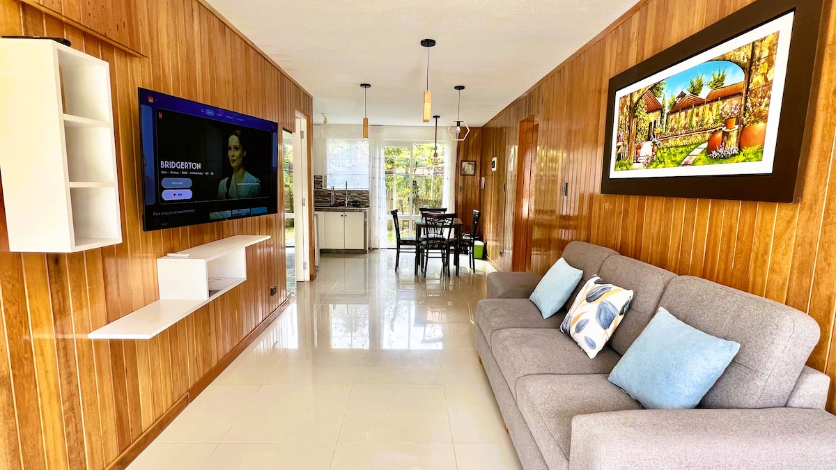 Relájate en este espacio tan tranquilo y elegante en contacto con la naturaleza, rodeado de árboles altos y antiguos que cantan con el viento, viendo a las aves, luciérnagas y las estrellas desde nuestras terrazas amplias en cómodas tumbonas acolchadas o desde dentro por nuestros amplios ventanales y mamparas. Cocina cómodamente con todos los artefactos necesarios, disfruta de tus películas favoritas en una amplia sala o trabaja con un WiFi estable a un paso del bosque y 10 min de la ciudad.