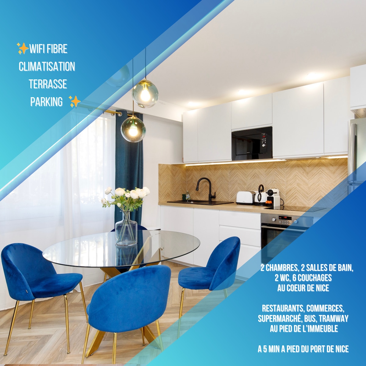 Entièrement rénové par un architecte en 2023, cet élégant appartement façonné avec des matériaux haut de gamme saura vous offrir tous le confort pour un séjour INOUBLIABLE dans notre région. Que vous soyez un couple en vacances, voyageur intrépide ou en déplacement d'affaire vous n'aurez aucun mal à vous y sentir comme CHEZ VOUS ! L’appartement est idéalement situé dans l’hyper centre niçois: Gare de Nice: 5 min à pied Place Massena: 5 min à pied Vieux Nice: 10 min à pied Plage: 12 min à pied