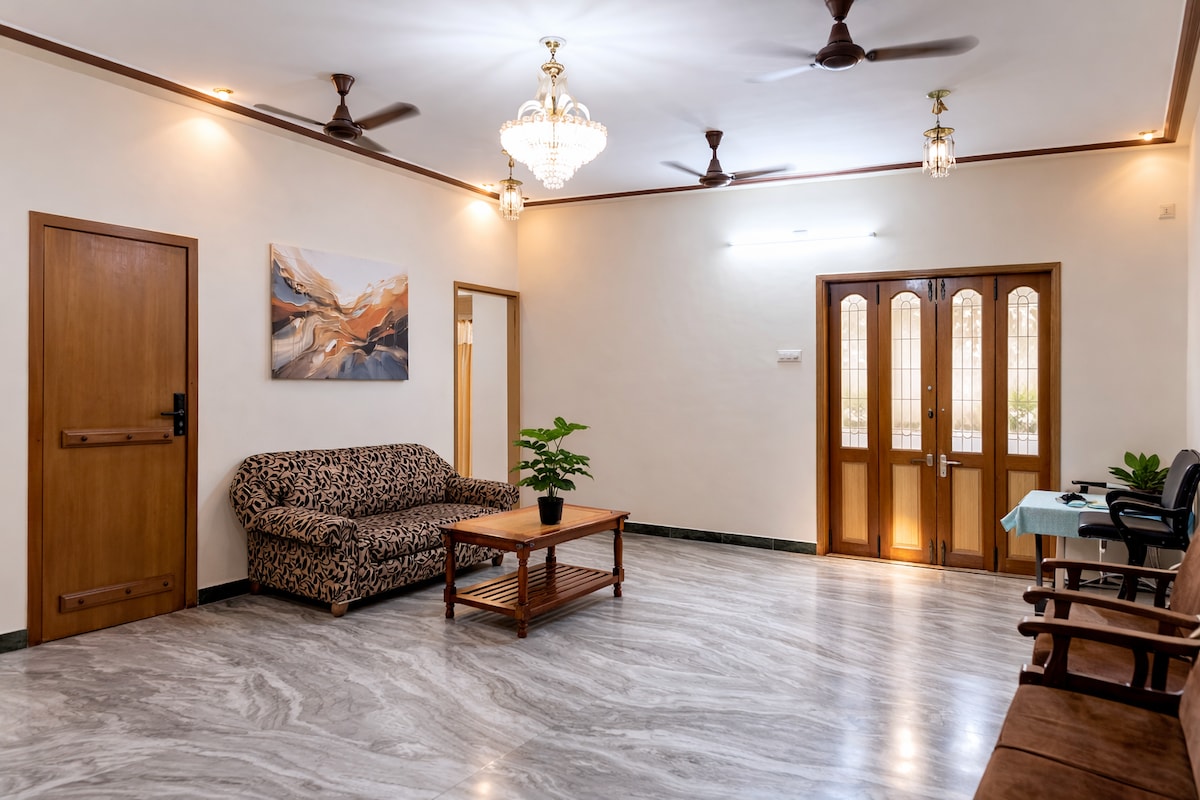 Cozy and modern 3BHK Airbnb just 2.5 miles from Madurai Railway Station🚉 Perfect for an enjoyable stay. 🏡 Fully furnished, 3 spacious bedrooms🛌with washing machine, fridge, fully equipped kitchen. Home has 8 ceiling fans🪭Has RO water🚰,iron box, exhaust fan, laptop work table, dining table, water heater, WI-FI🛜 a swing !__! Home has neem trees in all 3 sides. 🌳 Secure car parking. 🅿️ Living room and one bed room have smart TVs.📺 Flexible check-in &check-out time