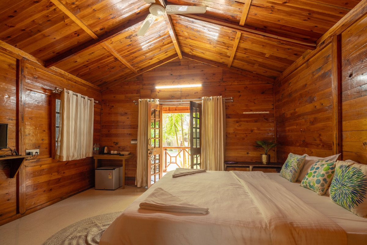 This is a beautiful AC room in a serene small River Front hotel walk to beach at Cavelossim beach which is aprx 5 minutes walk . Its a stay for all age group from couples , families and small groups upto 30 pax , our in house famous multicuisine restaurant is icing on the cake . Super markets , wine shops and multiple restaurants are all at walking distance . In House travel desk will help you plan your day trips if required.