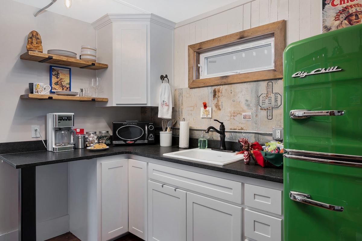 結合新舊...入住這個鄉村寶石時,感覺清新。 SC可以舒適入住4人。 小廚房配有咖啡機、烤面包機、電水壺、微波爐和冰箱。 浴室內有額外的設備與服務,以防你忘記一些東西。 淋浴間有外露的銅管,一定會令人印象深刻。 外面有一個有阿迪朗達克椅子和燃氣火坑的小露臺,可俯瞰牛牧場和令人驚嘆的Panhandle日落。