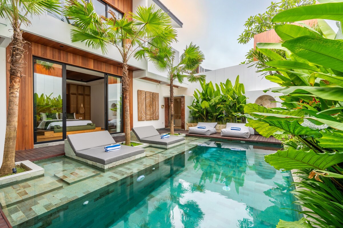 我們的3間臥室豪華別墅融合了現代設計和熱帶魅力。 滑開玻璃門,跳入四周綠意盎然的私人泳池。 這座 2 層別墅設有屋頂休息室、三溫暖和冰浴,非常適合放鬆身心。 開車僅需4分鐘即可抵達Finns和Atlas等頂級海灘俱樂部,步行即可抵達Baked Berawa的很棒的咖啡和糕點。 這是您的私人綠洲,靠近峇里島的所有最佳景點。