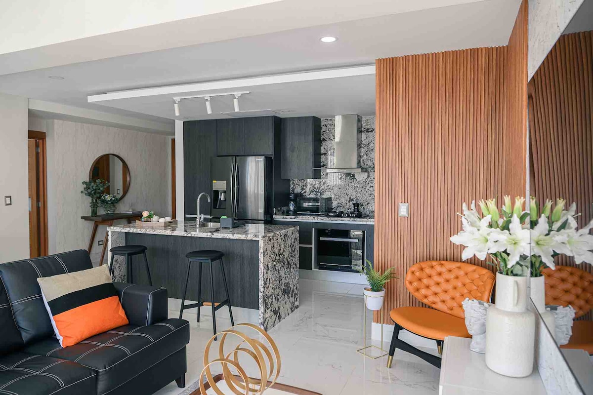 入住這間位處中心地段的房源,享受這裡的時尚品味。這是一個完美的公寓,適合在城市中度假、度假或尋找安靜的工作空間。配備空調、高品質電器和現代裝飾,讓您在每個角落都感到舒適。我們在屋頂、游泳池和健身房設有戶外區域,配備您運動所需的一切設施。
