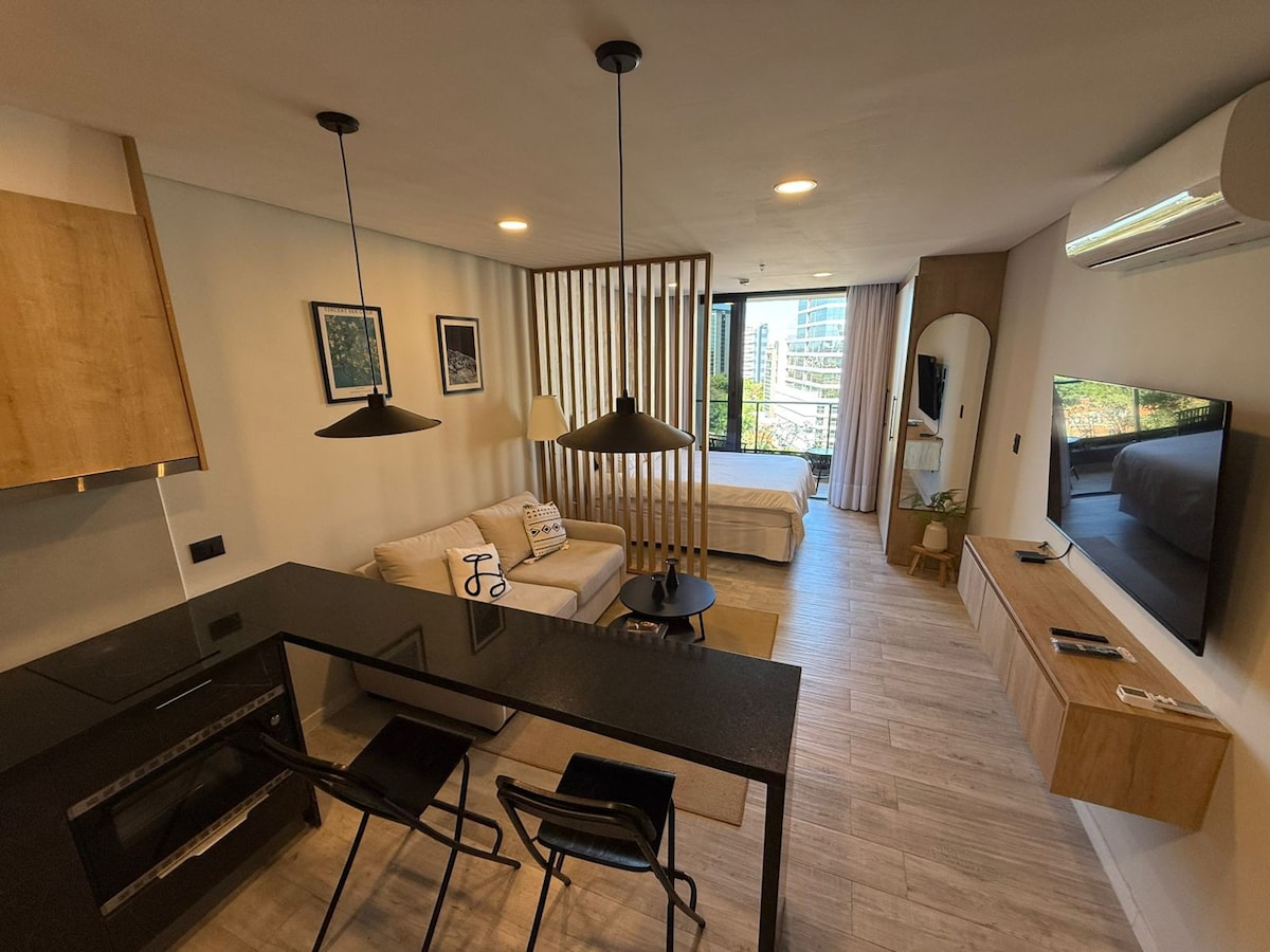 全包式服務! 「您希望在旅程中獲得的最佳體驗」使用數位鎖/接待和24小時保安 位於6樓,景觀優越,因為它位於國際化的住宅區,有許多運動綠地、churrasqueria超市、食品店和進口產品、購物、私人醫院,距離5至10分鐘。 我們的房源準備好接待短期或長期住宿的人士,無論是工作或度假。 目的是享受它! !