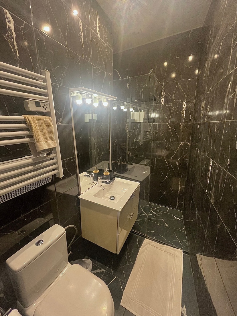 豪華大樓中的新公寓,位於一樓,街道上車流量不大。 狀態完好。 客廳/餐廳/廚房,內部花園旁邊,露臺上有一張小桌子和兩張椅子,非常安靜 兩間舒適的臥室,鋪有地毯,面向街道,配有一張可分開的雙層床和/或一張可容納 3 歲以下嬰兒床。 浴室配有浴缸/淋浴間,全大理石裝修。 符合殘障人士標準的門。