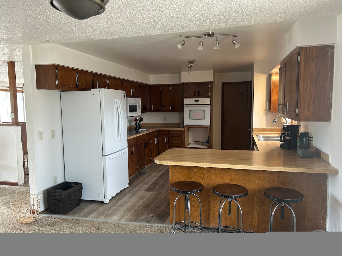 這間迷人的家庭友善租賃位於科迪WY和黃石公園之間,最多可供9位房客舒適入住。它包含2張單間公寓風格的雙人床和1張雙人床在獨立的臥室。房客可以享用全套廚房,配備爐台、烤箱、冰箱和吧枱座位。還有全尺寸洗衣機和烘衣機。廚房外有一間舒適的客廳,配有皮革沙發、石頭壁爐和寬敞的餐桌。