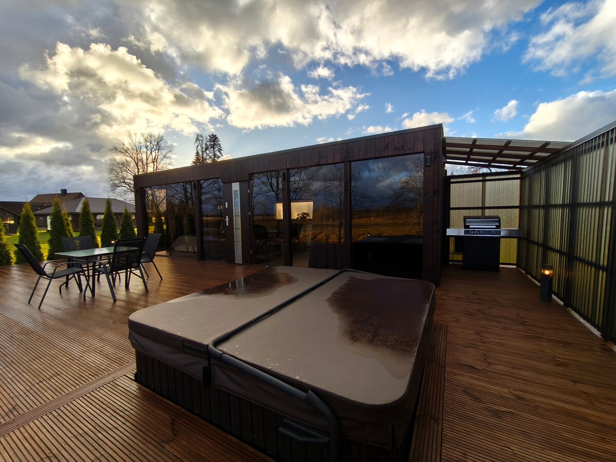 舒適的小屋,配有按摩浴池、桑拿房和燒烤區域