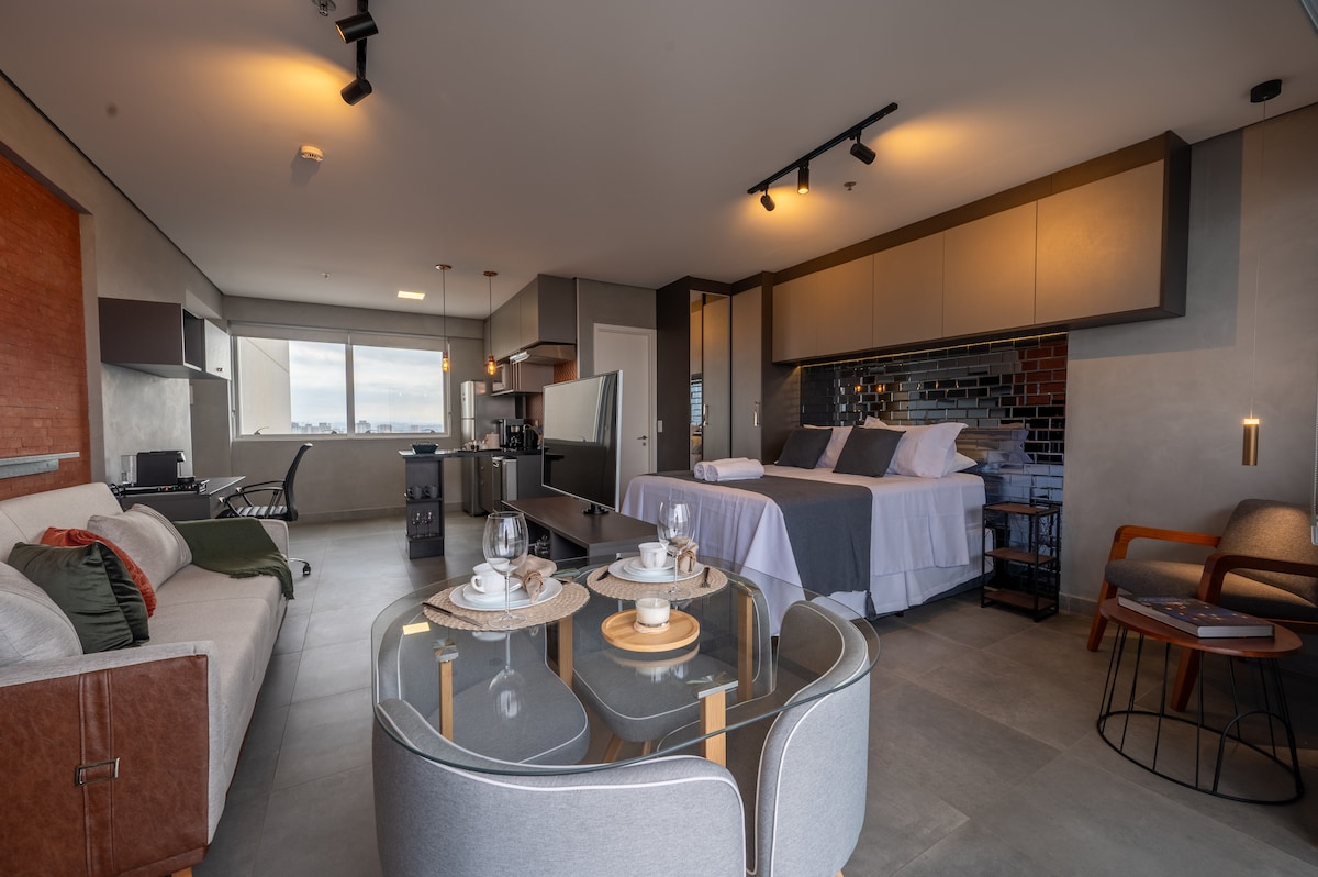 Estúdio espaçoso com muito design, arquitetura e a melhor vista de São Paulo. Loft completo! Com cama queen, closet, ar condicionado silencioso, cozinha completa, home office, WI-FI, TV 55” e uma belíssima banheira de imersão, de onde pode apreciar o seu drink preferido e curtir uma vista apaixonante. São Paulo toda estará há poucos minutos de você. Acesse o metrô andando apenas 200m. Reserve com tranquilidade! Proporcionaremos uma excelente hospedagem e uma ótima experiência!