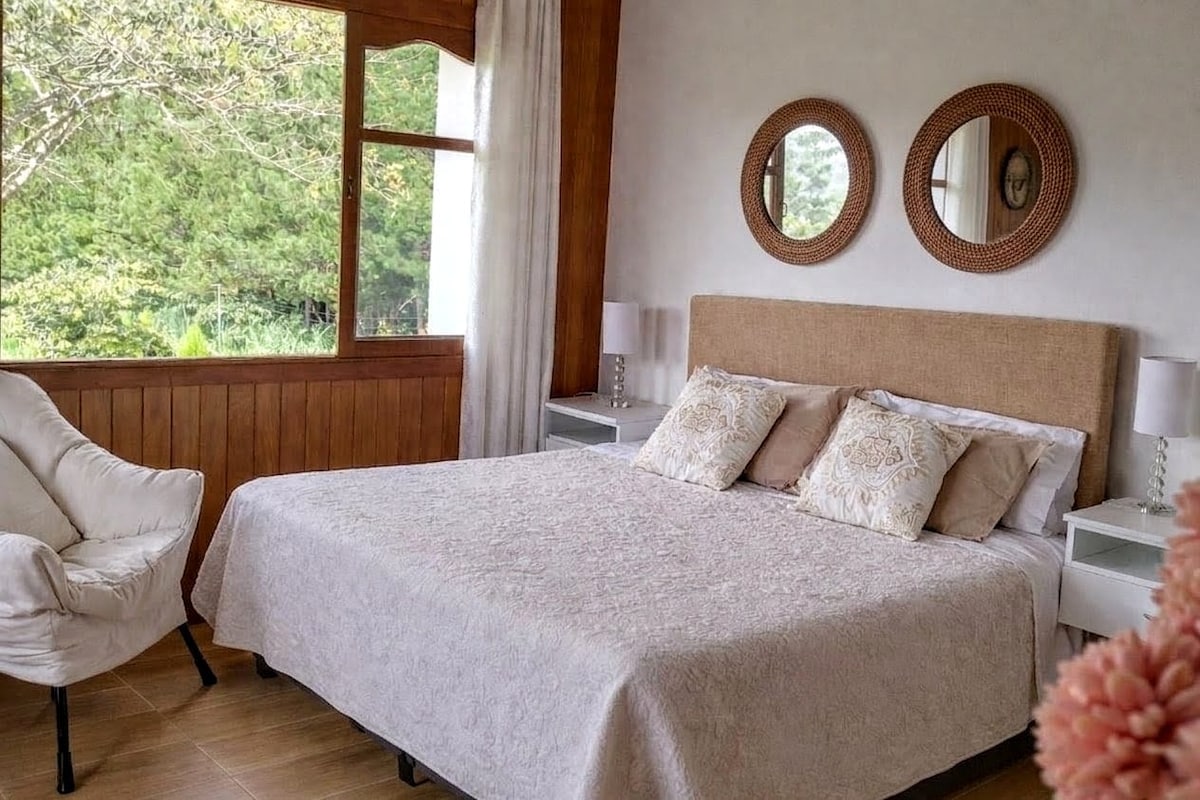 Casa Frey:在配有沙子和天然岩石的泳池中放鬆身心,在健身房鍛煉,在高端 65 吋 QLED 電視上享受 Netflix,或者只是欣賞鄉間風光。 我們有非常快速的光纖網路。 Casa Frey 在設計時著重於景觀,採用高大的窗戶;整棟建築完全使用高品質木材建造,採用桃花心木和雪松等優質木材作為飾面,並以 Usko Ayar 學派的畫作進行優雅裝飾。 保證隱私。