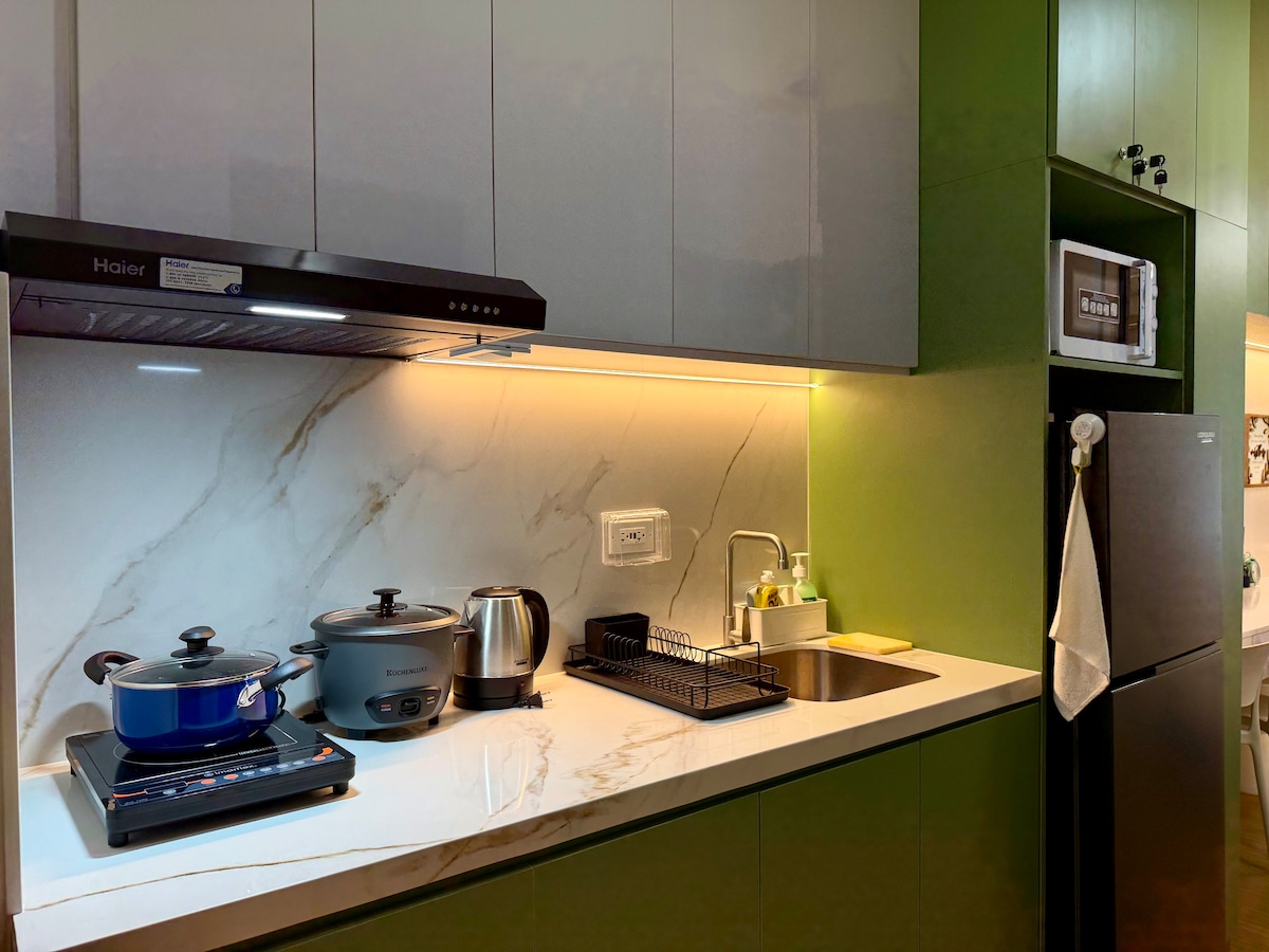 A cozy modern Scandinavian/tropical retreat nestled in the heart of the city. This is a place where you can relax, unwind and have fun with your loved ones or just by yourself. The living area is adorned with light-colored wooden floors, providing a warm and welcoming ambiance. Furnished with simple yet stylish Scandinavian/Tropical furniture. The kitchen is fully functional. Equipped with all your cooking needs. The bedroom’s minimalist design will for sure give you a restful night’s sleep.