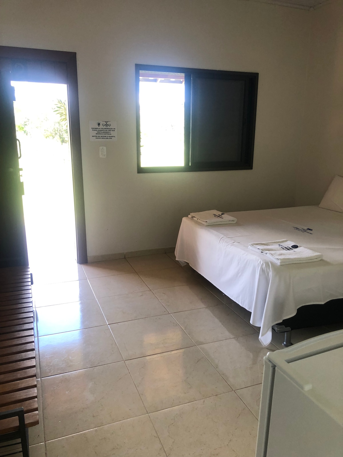 Quarto 105 com opção de 1 cama de casal ou 2 camas de solteiro e banheiro compartilhado.