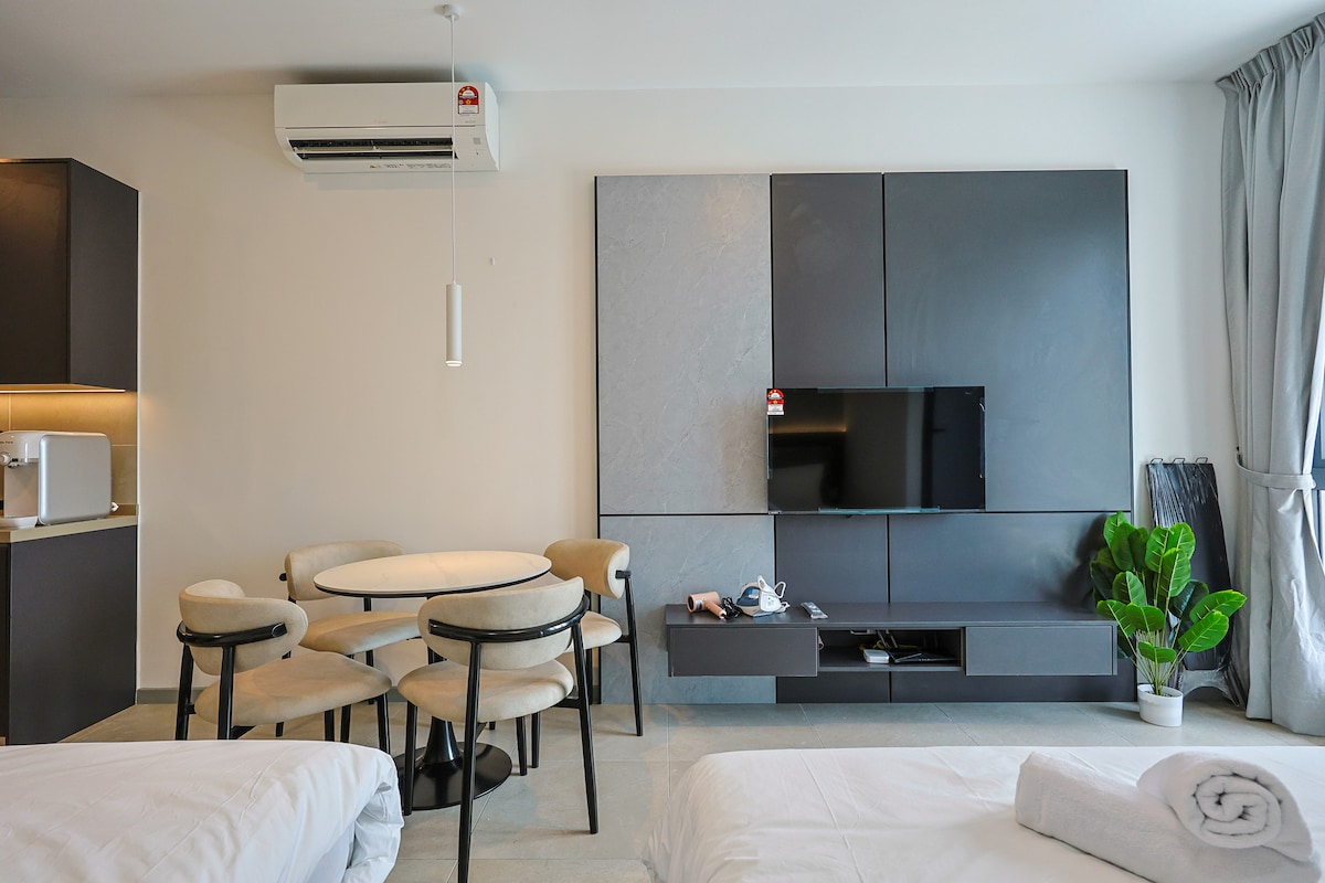 我們的2間臥室舒適套房位於槟城市中心,可輕鬆前往當地旅遊景點。就像入住飯店一樣,享有按摩椅、廚房、洗衣房和可愛的城市景觀。非常適合情侶、商務差旅人士和小家庭。 如果您餓了,別擔心,日式/韓式餐廳和7-11就在樓下。步行5分鐘即可抵達當地美食、OldTown、披薩、肯德基。 如果您喜歡這個繁忙城市中的安靜舒適的地方,您一定會喜歡我們的地方!