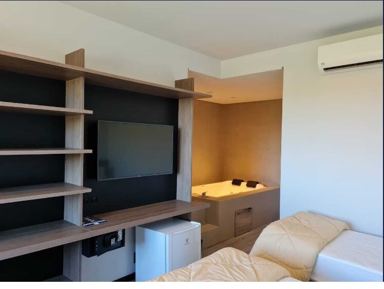 Aproveite o glamour deste lugar elegante e sofisticado, que fica em frente ao Parque Beto Carrero World. Suíte Super Luxo com vista para o Parque Beto Carrero. Possui banheira de hidromassagem e banheiro com ducha. Ar condicionado, SmartTV a caboe Cofre. Possui 1 cama de casal e duas cama de solteiro. O hotel possui estacionamento, wi-fi, piscina adulto aquecido e infantil, fitness center, playground, brinquedoteca, salão de jogos, gastrobar, lounge.