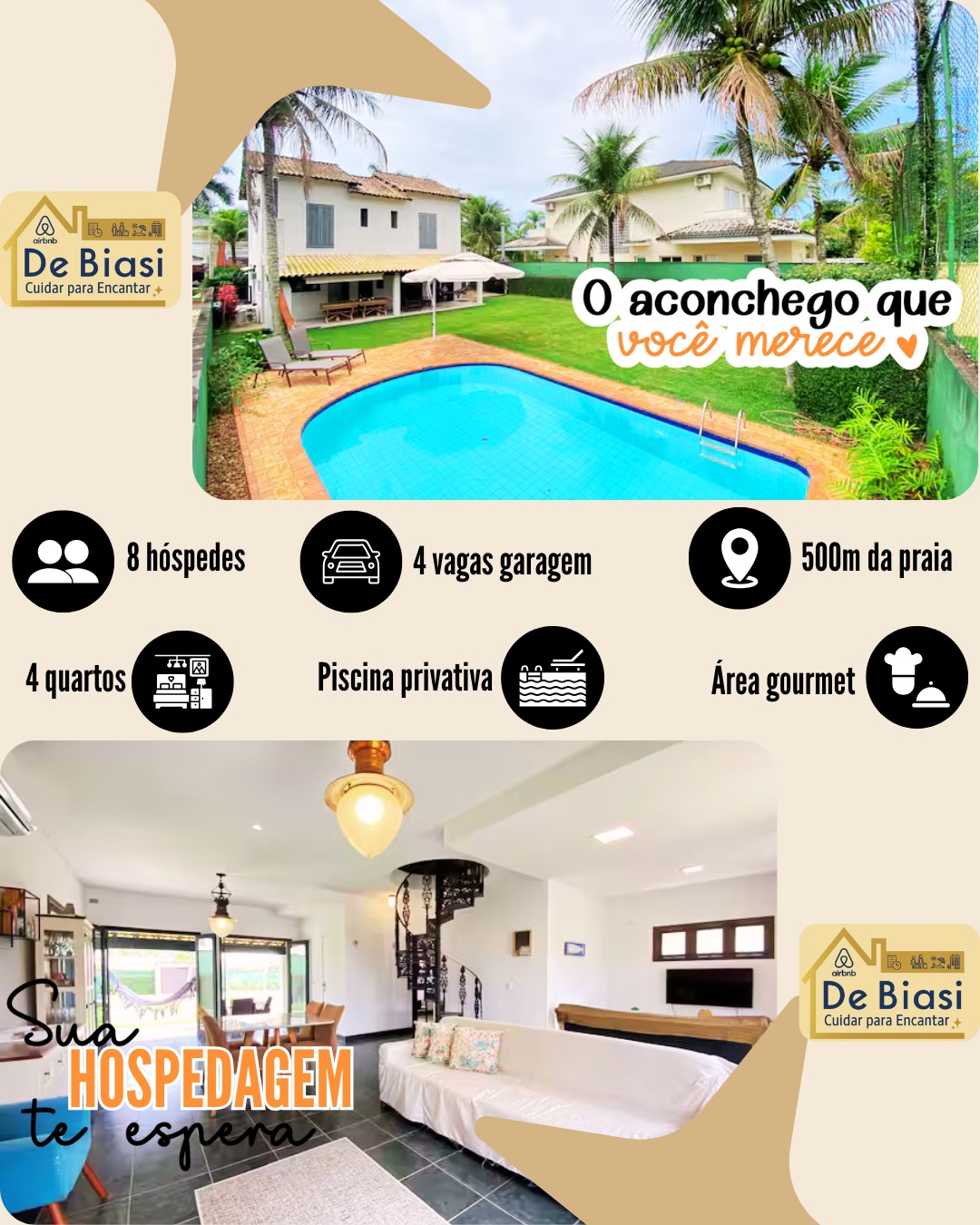 在這間美麗、寬敞和超級舒適的房子中享受美妙的日子,距離瓜魯雅最美麗的房子之一伯南布哥海灘( Praia do Pernambuco )僅3分鐘路程🌊☀️。 •配備燒烤設施的美食區 •高速WiFi •免費按摩椅 •室內壁爐 有4間臥室( 2間套房)、3間浴室、餐廳、客廳、100%設備的廚房和4個停車位。