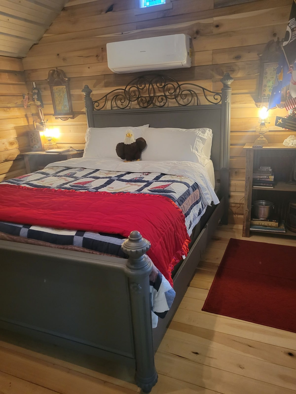 Enjoy the lovely setting of this romantic spot in nature. This cabin is decorated with the spirit of America The owner's great grandfather, Ezra G, was one of 8 men that stole the printing press in MO that printed the very first military newspaper...Stars & Stripes. The cabin celebrates the spirit of America in its decor. You will also find the owner's purple heart on display. Each cabin has a Q-size bed, padded sleeping loft, kitchenette, full bathroom, temp controlled & porch swing