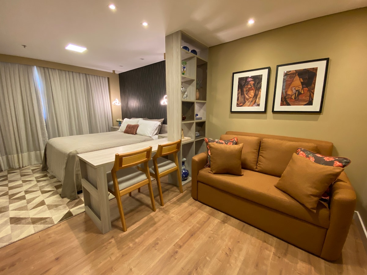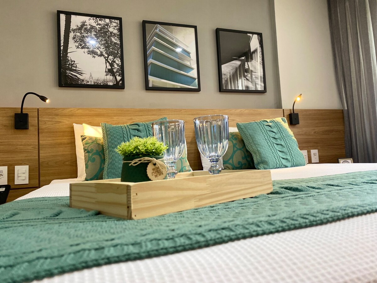 全套公寓套房,配有空調、中央加熱淋浴間、迷你廚房、可俯瞰保護區。 免費Wi-Fi、智慧電視、有線電視和網路、Youtube等。 該空間不需要探測器,所有電器都是電動的(包括熱水器),沒有壁爐或附屬車庫。 Flat - Pau Brasil 提供免費停車位、24 小時接待服務。現場有室外溫水和非溫水泳池、桑拿房、健身房、水療中心、酒吧、餐廳等。