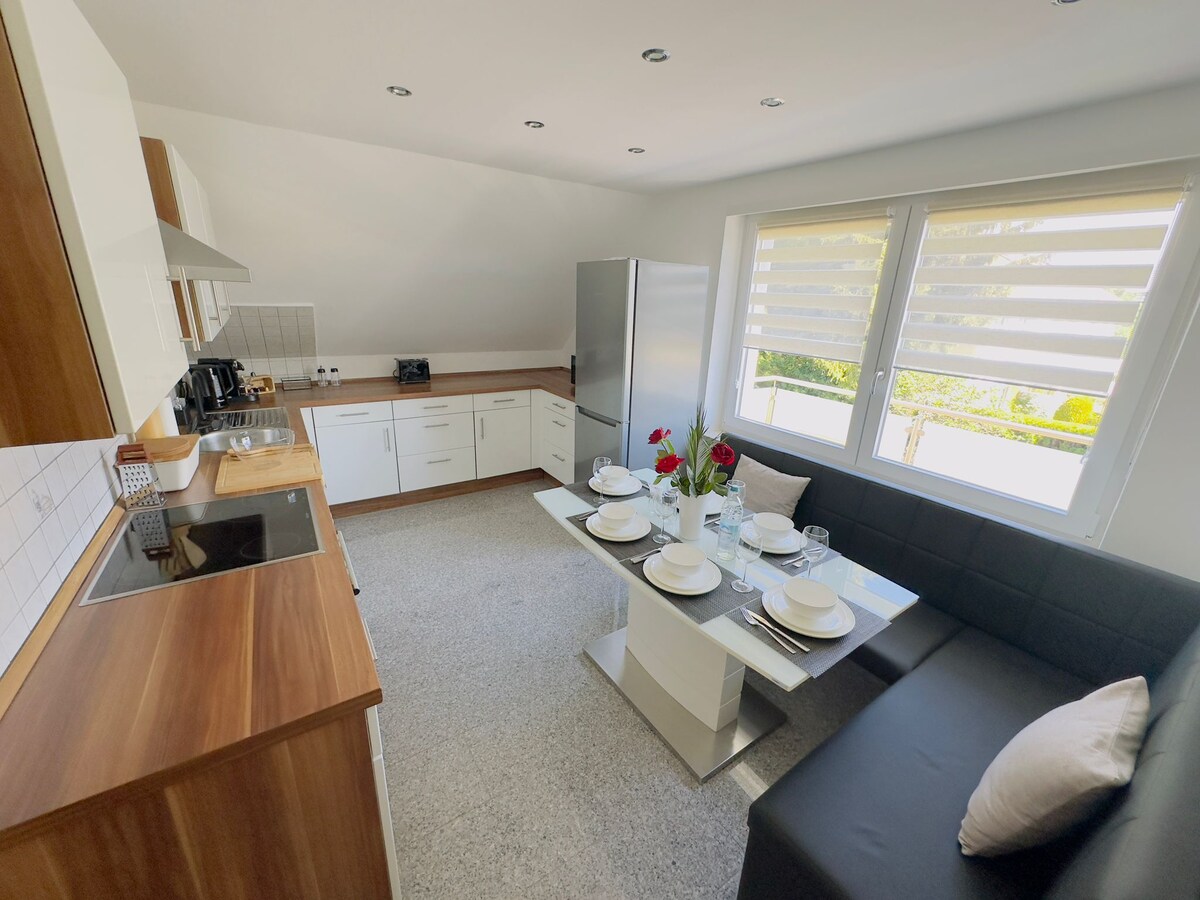 我們的公寓最多可供 10 人入住,是您城市旅行的理想住宿! 非常適合商務差旅或家庭旅行。 110 平方公尺、舒適現代的公寓位於一樓,靠近高速公路。 公寓提供3間臥室,配有 4張單人床和2張雙人床、1間客廳和用餐區、廚房和用餐區、浴室、廁所和帶烤架的花園。 您還有免費停車位,距離市區10分鐘。