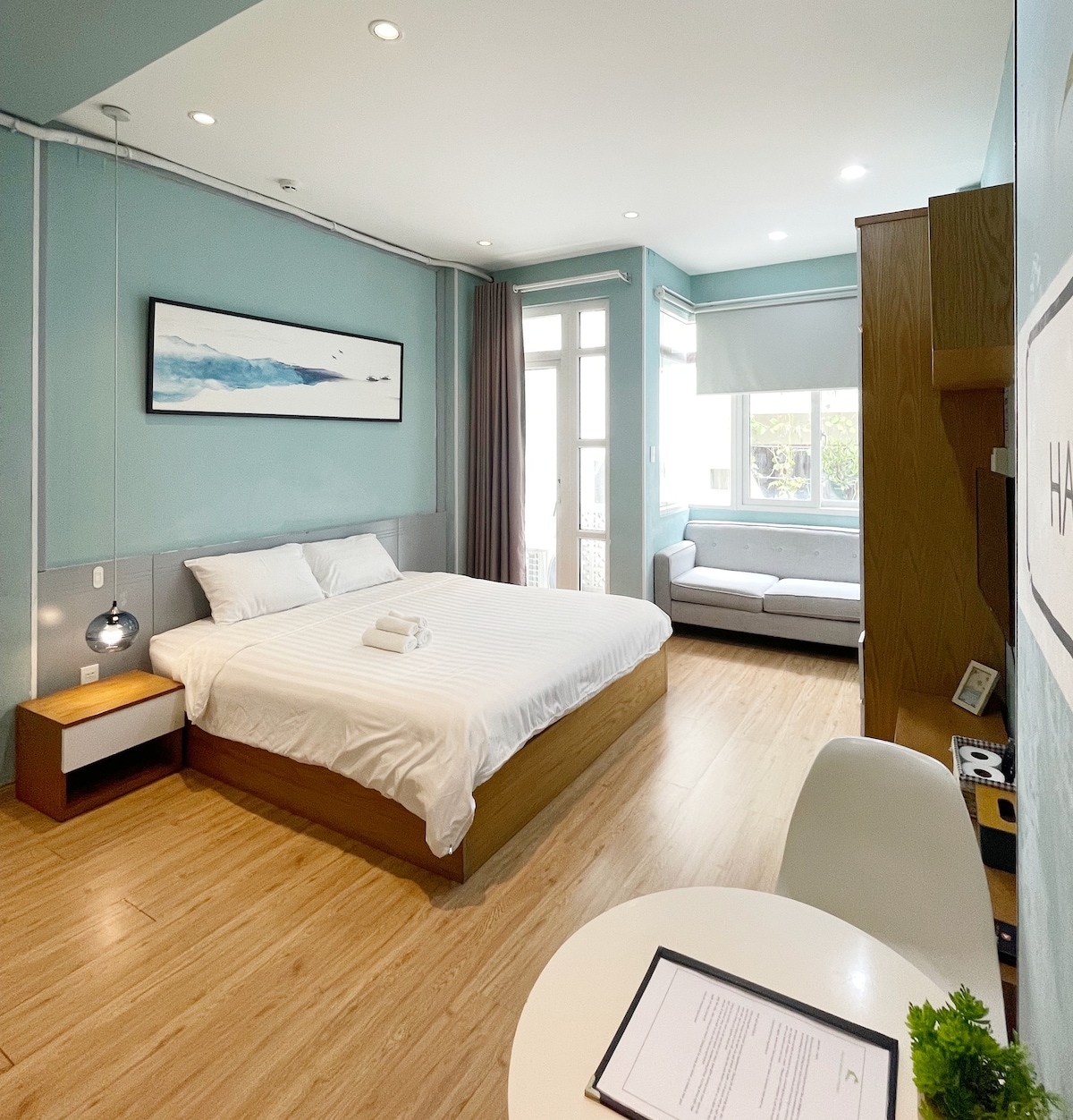 成立於2023年,我們提供高品質的短期和長期服務式公寓,位於繁忙的街道上,附近有著名的咖啡廳、餐廳、Circle K和便利商店,步行幾分鐘即可抵達碧文街(Bui Vien)、陶丹公園(Tao Dan Park)。與飯店相比,我們提供1間獨立的單房公寓,配備現代風格、廚房、陽臺、隔音門窗、辦公桌、屋頂花園、電梯、定期清潔和「家外之家」的舒適。