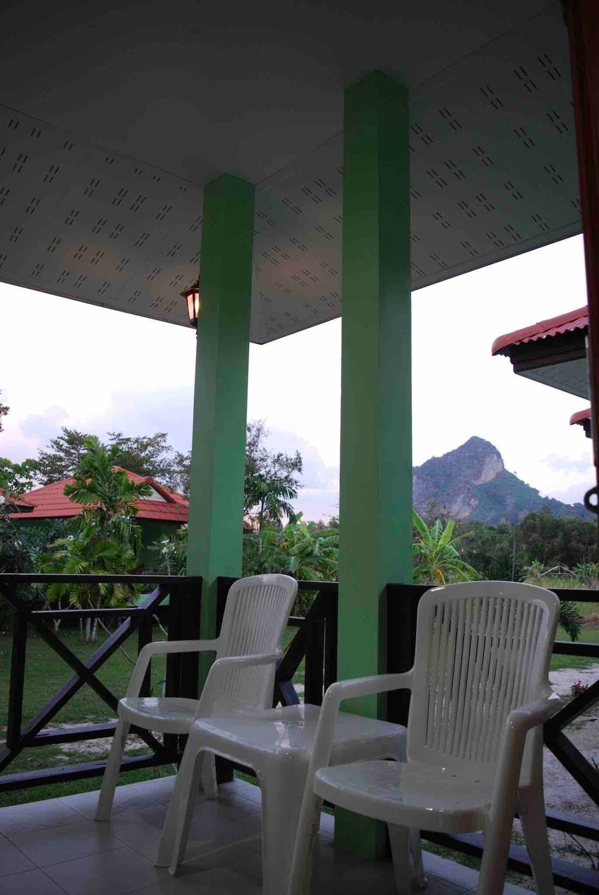 The bungalow is private (only one bungalow) with bathroom on-suite – it is built over a fish pond and adjacent to a beautiful creek and bird aviaries. It is situated in a semi-rural Thai farmstay / getaway with outdoor activities & sights such as – • Kayaking * • Cycling * • Fishing * • Swimming • Walking • Large vegetable garden • Free range domestic animals • Creek with fabulous swimming • Mountain views • Rural Thai activities eg rubber tapping Refer Ecovilla 2 adjacent hse appox 100m away