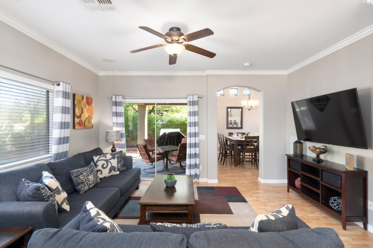 豪華4間臥室,配有4間套房浴室,總共5.5間浴室。步行即可抵達雜貨店、餐廳、酒吧和購物商店。完全升級。完美的開放式平面圖,從廚房延伸到後院,再到商業風格的餐廳酒吧! 設備齊全的酒吧,配有多台電視、2台啤酒機和一個超大的冷凍櫃,可用於磨砂玻璃杯。 溫水泳池每晚75美元。一切都很方便、乾淨、新穎和舒適!新家具。快速前往斯科茨代爾舊城區和駱駝背路!