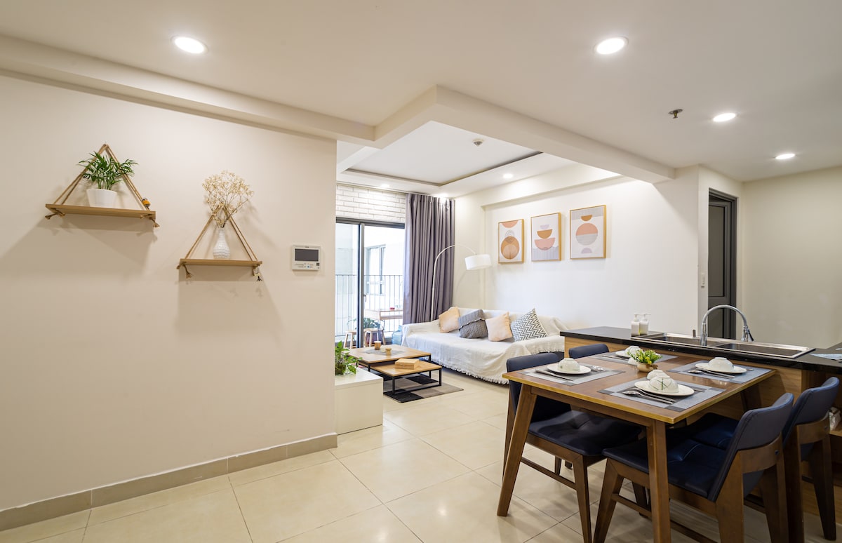 This unique place is designed for a luxury-in-style experience. With a smart sliding door, your living room and bed room are easy connected to maximize spacious 50m2 house. Walking on the BaSon bridge between the condo and D1, you can feel the breeze of Saigon river and spectacular view of the city. By just 5 to 10 min on cab, you can get to city center.