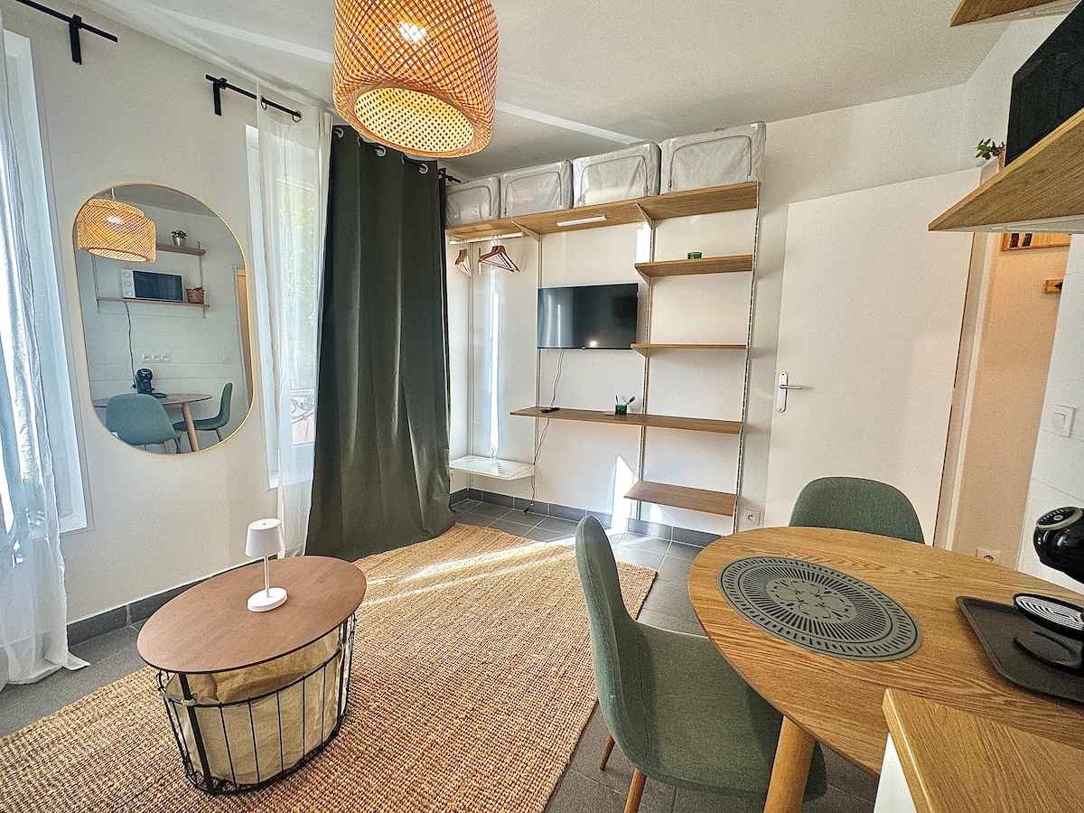 Vous disposerez de l’aile gauche d’une demeure d’un quartier résidentiel du centre-ville, Proche tous commerces, Monoprix, Salle des Ventes. Duplex indépendant de 47 m2 très lumineux, totalement équipé, tout confort. Chambre à l'étage avec terrasse, douche à l’italienne et WC. Vue dégagée sur parc et casino pour les joueurs Grand séjour avec cuisine américaine, salon sous verrière, accessible au travers d’une terrasse de plain pied, et jardin comprenant un emplacement pour deux véhicules.