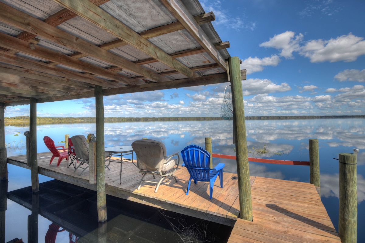 遠離一切,盡情享受舊佛羅裏達! 在迪斯頓湖上劃獨木舟或皮劃艇,欣賞真正的佛羅裏達大自然。 最多可容納11人,配有現代化廚房、休息區、遊戲室和按摩浴池。 適合所有人的東西。聖奧古斯丁、代託納、美國太空海岸、迪士尼和當地州立公園的絕佳基地營地。 在沙灘上提供沙灘用品和釣魚設備,或在湖上釣魚。