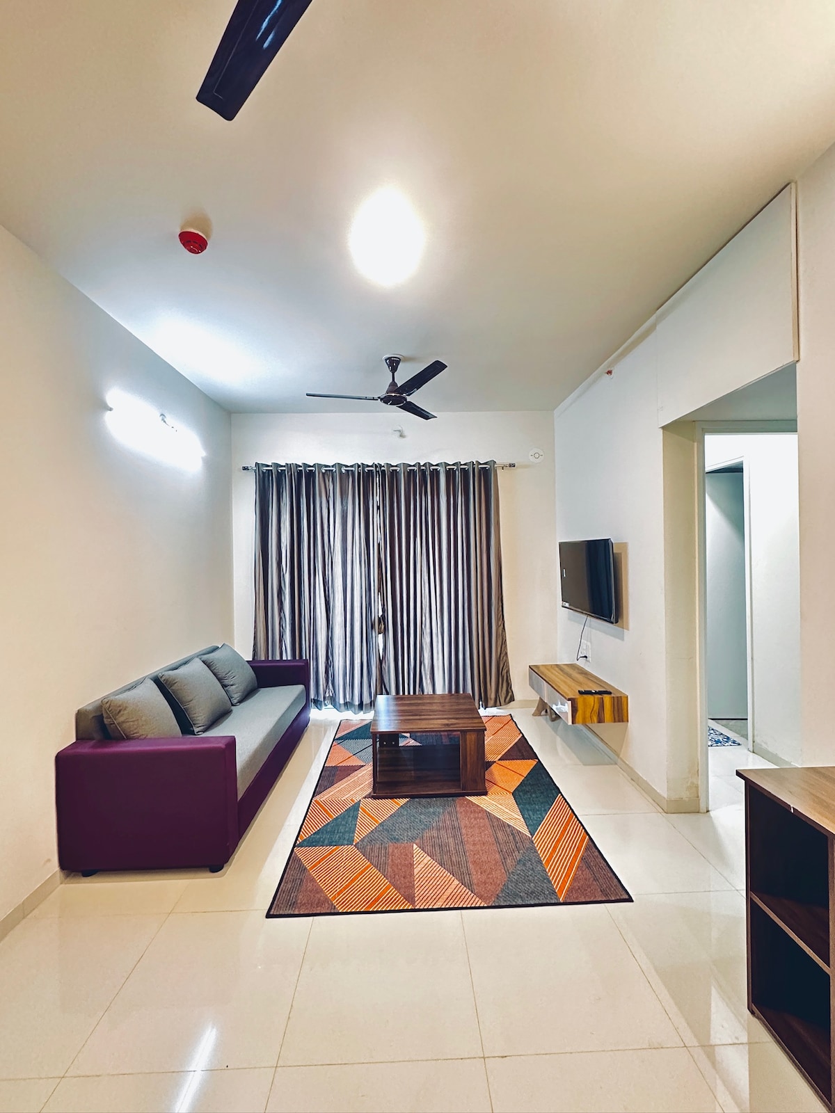 Wake up to stunning sunrise views at The Cozy Cove, a serene retreat in Pune’s Blue Ridge Township. This modern, fully-furnished apartment features a cozy sofa cum bed, a restful bedroom with soft linens, and elegant interiors designed for comfort and style. Enjoy Netflix and chill nights on the smart TV, a serene balcony setup, and a sleek modular kitchen equipped for all your needs. Perfect for couples or small families, it’s a peaceful escape with all the conveniences of home.