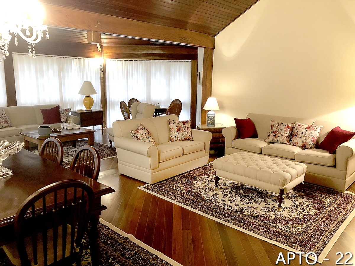Flat em Campos do Jordão no Condomínio Quatre Saisons, próximo ao Pico do Itapeva. O apartamento de 64m² possui um quarto com cama queen e sala com um sofá cama que também vira cama de casal. Temos serviço de quarto diariamente e dispomos de toda roupa de banho e cama. O condomínio conta com piscina aquecida, quadra de tênis e poliesportiva, saunas úmida e seca, academia, jacuzzi e garagem coberta. Durante a estadia o hóspede poderá desfrutar de uma linda vista das montanhas ao redor.