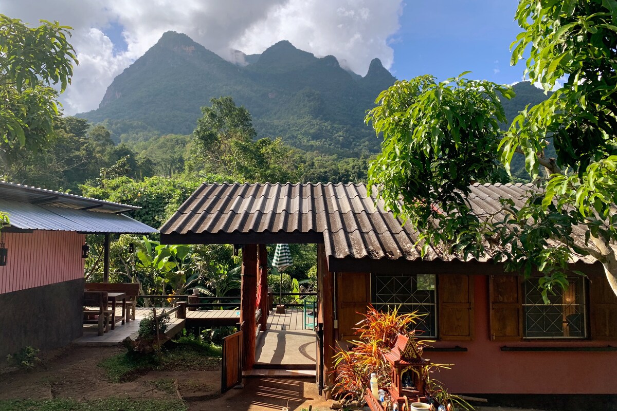 我們的柚木屋坐落在Doi Luang國家公園旁邊的大型私人莊園上,距離溫泉僅1.5公里,可欣賞壯麗的山景。 四周環繞著竹林和柚木森林,提供寧靜、安全的氛圍,充滿鳥鳴和大自然的聲音。 雖然沉浸在大自然中,但距離村莊僅3公里。 放鬆身心、重新連接和享受清道自然美景的完美地方。