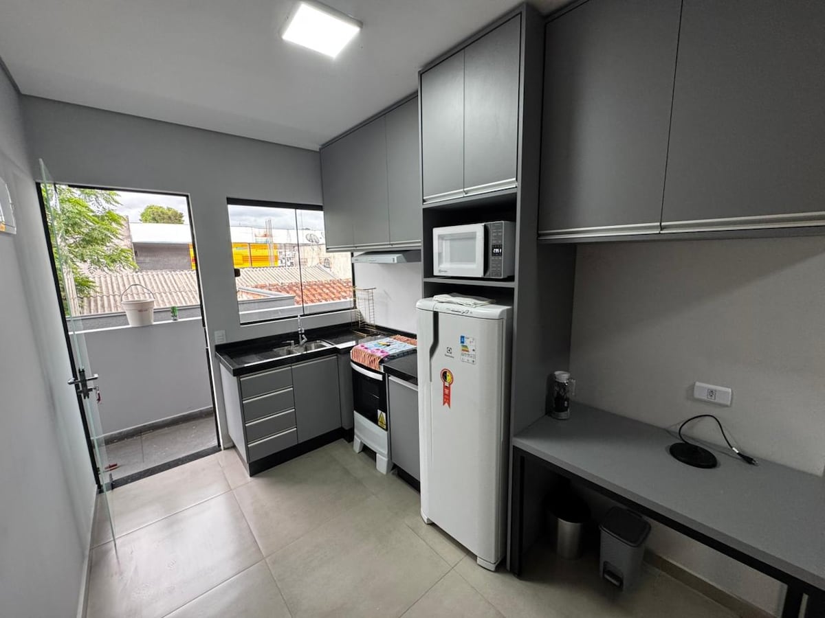 舒適且位置優越的Kitnet ,距離BR幾公尺,非常適合那些路過、工作或尋找觀光的人。空間可容納3人,環境緊湊且功能齊全,配有雙人床、單人床、扶手椅、設備齊全的廚房、全功能浴室和停車位。前往高速公路很方便,距離市中心5分鐘,有市場、餐廳、商店和藥店。簡單、實用,配備舒適住宿所需的一切設備!
