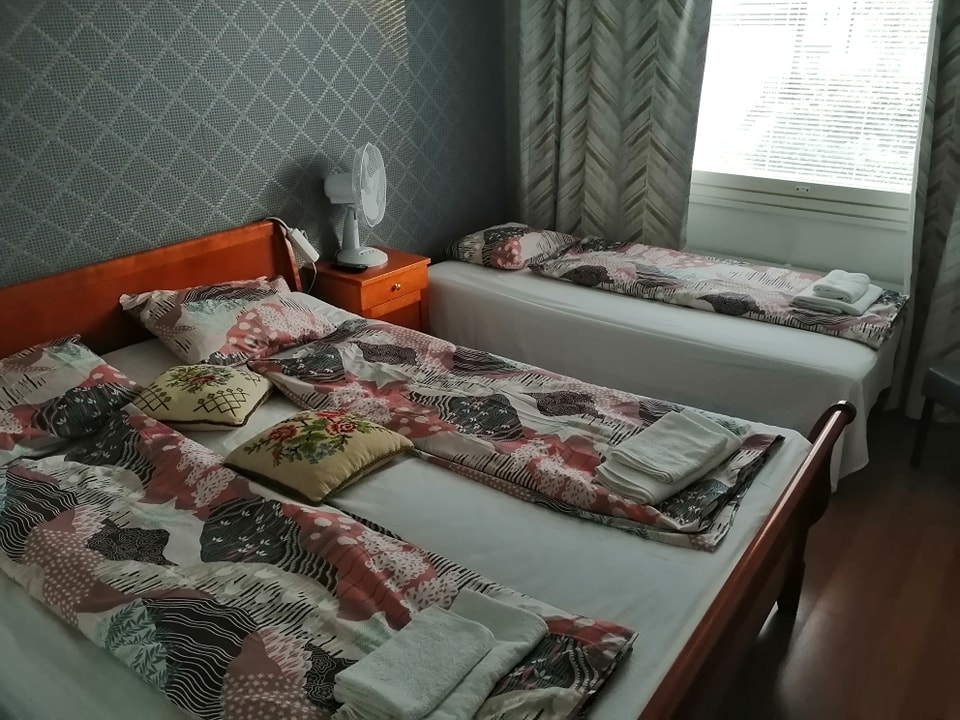 You can stay cheaply in a 4-person doubleroom on business or vacation trips. Located on the side of the yard. Two separate beds and one double bed. Pets are not allowed in this room. Double bed and 2 beds. All our room prices incl. VAT 10.0% and towels & bed linen included. Easy and free parking & WiFi. All rooms have so-called kitchenette with fridge, own shower and toilet. You will find our accommodation on the main street opposite the market square, right in the center of Virrat city.