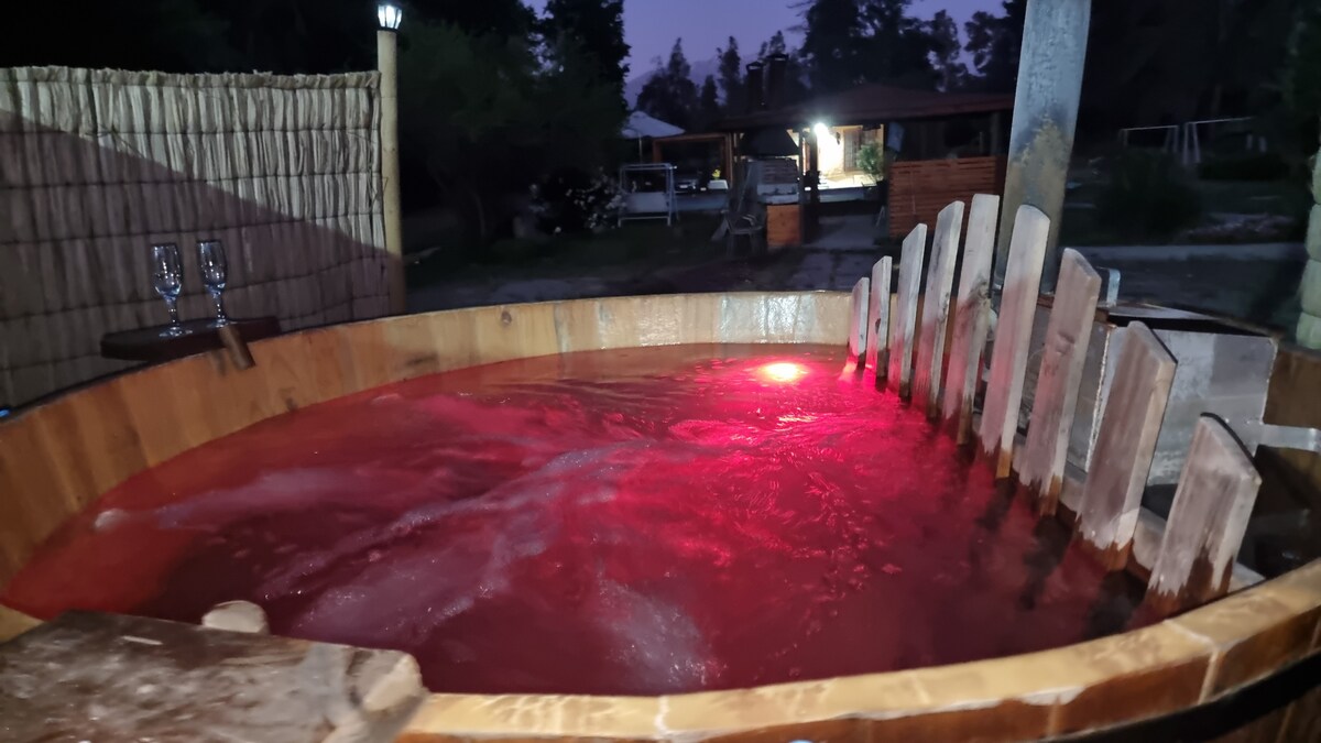 Escape to Tranquility in Our Cabin with Private Hot Tub in Pirque We invite you to discover tranquility at a cabin near Santiago. Located in Pirque, home to Chile's most iconic vineyards and just minutes away from the majestic Río Clarillo National Park, our cabin offers a modern retreat where relaxation takes the spotlight. Enjoy the privacy of your own oasis with a hot tub equipped with hydrotherapy. The cabin is designed to blend modern comfort with the natural charm of Pirque.