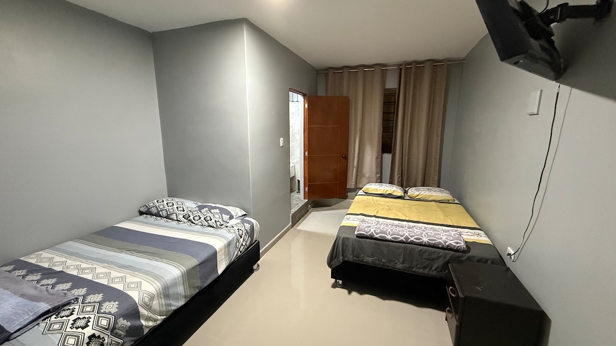 住宅內的房間,完全舒適,遠離城市的噪音,有您需要的一切,讓您好好休息。 43吋智慧電視連接到WiFi、衣櫃,以及一張小桌子,配有兩張椅子,可供遠距工作,浴室冷熱水。 在大廳裡,我們有冷飲 在皮尤拉( Piura )尋找我們的Hotel Palmera verde