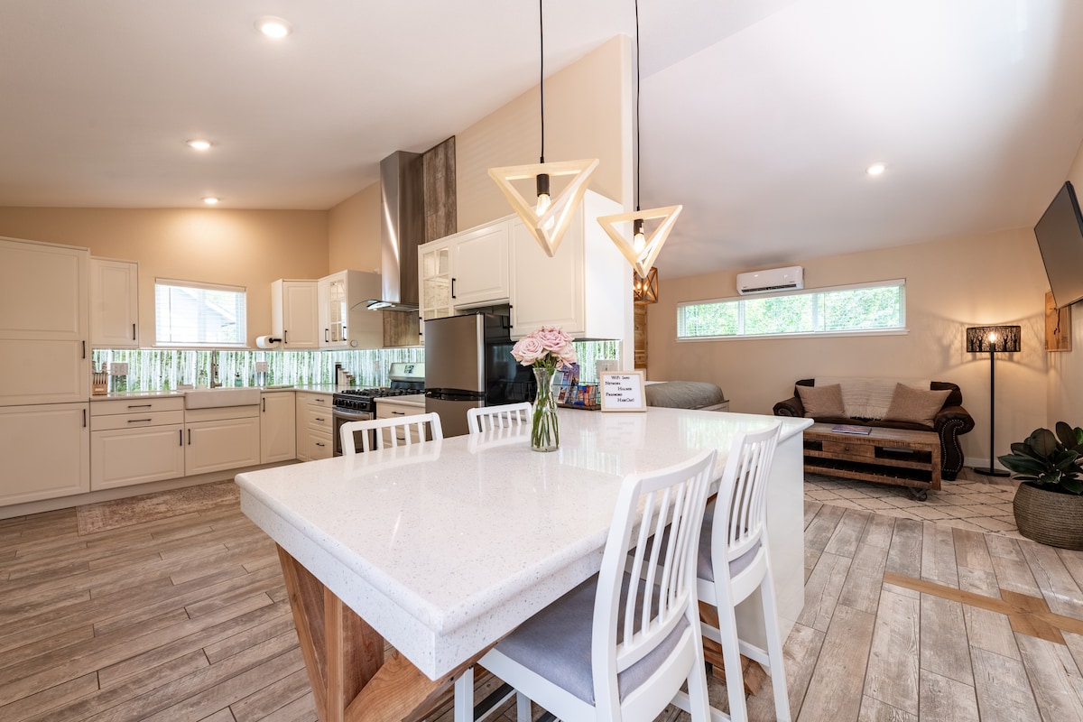 後院有河流,旁邊有私人熱水浴缸和大型瓦斯火坑,適合您的所有派對,您還需要什麼?! 如果您喜歡在豪華的後院觀賞當地野生動物穿過小溪,這裡非常適合所有季節,那麼您應該預訂這裡。 享受廚房的全套設備,包括策展人的觸感、加熱毛巾架、遙控氣體壁爐、氣體烤架、2023年從上到下的改造。 立即預訂RiverHouse North, by Forest & Peak Retreats!