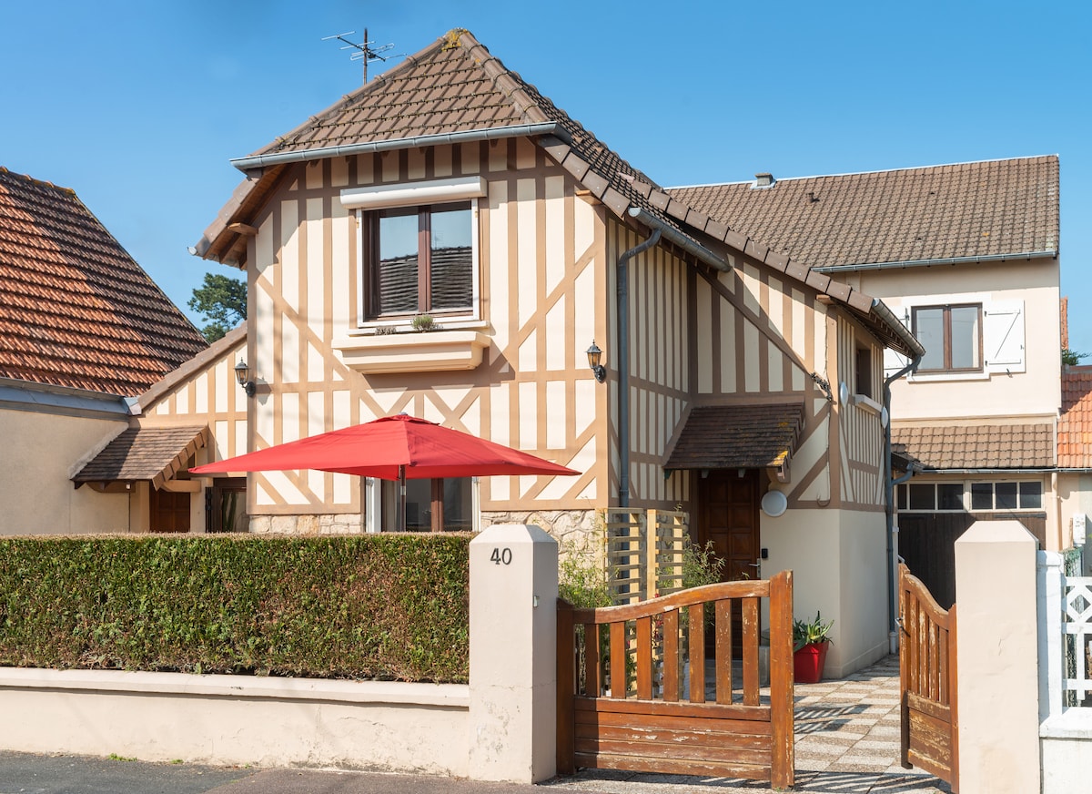 Maison avec jardin, 50m2, lumineuse, plein sud, à 100m de la plage, côté tranquille de Ouistreham RivaBella. Dans la propriété des hôtes mais totalement indépendante, au calme avec terrasses, jardin, transats, table et chaises, parasol. Lit 160 cm, grande salle de bain , volets électriques Parking gratuit facile même en saison. Pistes cyclables , thalasso, casino. A mi-chemin de Deauville-Trouville et les plages du débarquement. Ménage (40€)à régler à l'arrivée + électricité au départ.