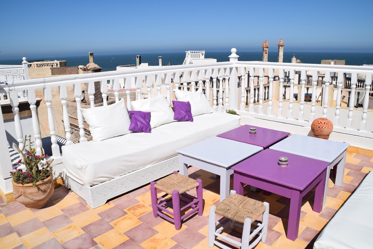 RIAD SALTANA - Essaouira. 寬敞的臥室,有2扇窗戶(其中一扇有小海景)、衣櫃和沙發。 配有浴缸的浴室。 除了2人外,臥室內的第3張小床(70公分)可容納一名兒童或青少年。 臥室位於三樓,可直接通往第一個露臺。 包含早餐,在露台上享用,可欣賞海景。 客房內提供WiFi。 每人每晚需在現場支付 3 歐元的旅遊稅。