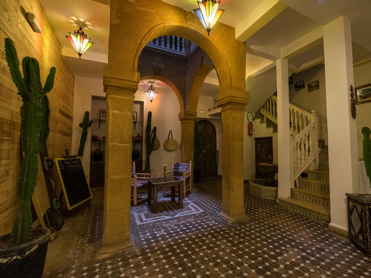 漂亮寬敞的房間,配有獨立浴室、暖氣、WiFi、漂亮的公共區域、可欣賞海景的漂亮露臺和俯瞰medina的屋頂景觀。您將享受我們的摩洛哥氛圍、極佳且完整的服務和庭院的寧靜。 早餐包括茶/咖啡麵包、黃油、美味果醬、新鮮橙汁、起司、可麗餅、新鮮番茄歐姆蛋、豐盛早餐