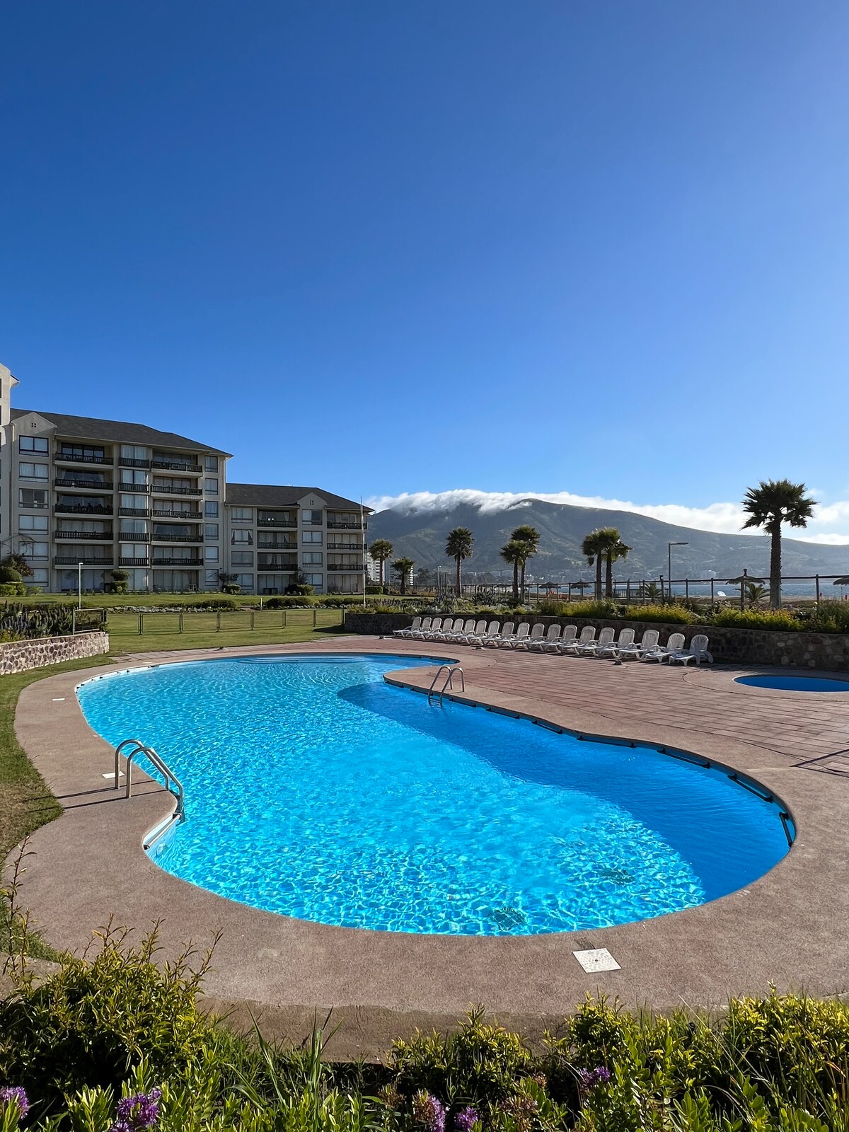 Hermoso departamento con amplia vista al Mar para Disfrutar en Familia, Amigos o Pareja. Cuenta con una ubicación privilegiada a 1 cuadra de la playa y comercios (restaurantes, Bares, Cafeterías, Supermercado, Terminal de Buses, etc). Tiene estacionamiento privado. Ven a descansar y vivir la experiencia de estar en una las mejores playas de la costa Chilena. El edificio cuenta con control de acceso, piscina con horizonte infinito, quincho, área de juegos y más.