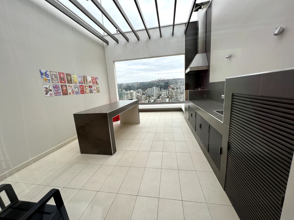 5* 維尼亞/瓦爾帕萊索:秋季優惠!景觀壯觀、設備齊全、提供停車位、健身房、全景露臺、洗衣房。 夏季戶外游泳池需提前預訂。 最佳性價比! 美麗、舒適、溫馨。您會有家的感覺! 不僅僅是住宿,這裡還有全景:明亮、安靜和住宅區。 交通工具在1/2個街區外、熨斗、智慧電視、吹風機、床鋪、藍牙音箱、榨汁機、烤箱、咖啡機、鹽、糖、茶、咖啡等。